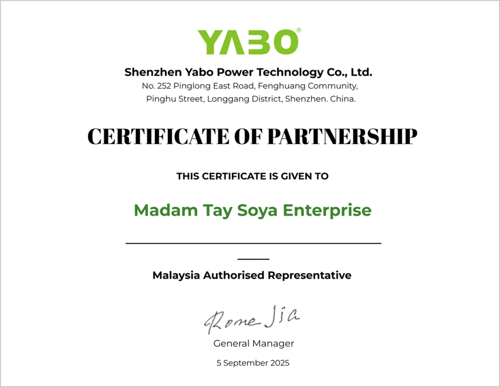 We act as the authorised representative in Malaysia for our manufacturing partner, Shenzhen Yabo Power Technology Co., Ltd., providing reliable access to high-quality products and solutions.