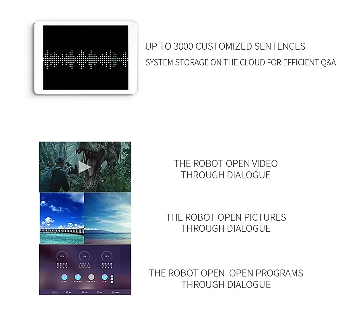 3. Casual Conversation:Chinese and English cloud-based voice libraries, no need to switch, enabling Chinese-English bilingual interaction, song selection, checking the weather, nearby hospitals, hotels, schools, restaurants and other facilities, as well as calculating distances and routes, etc.