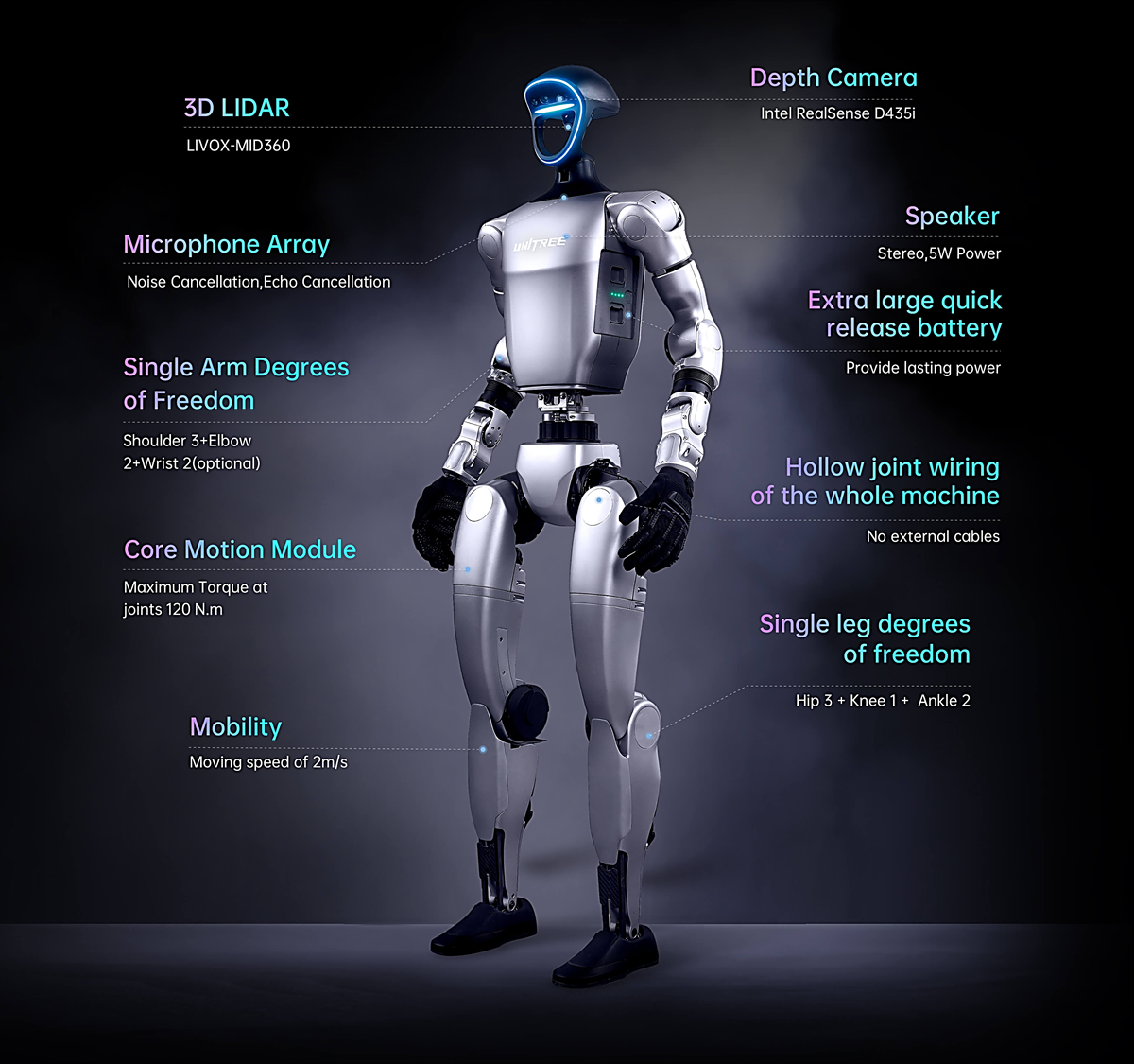 • Sensors: Livox Mid-360 LiDAR, Intel RealSense D435i Depth Camera, Mic Array.